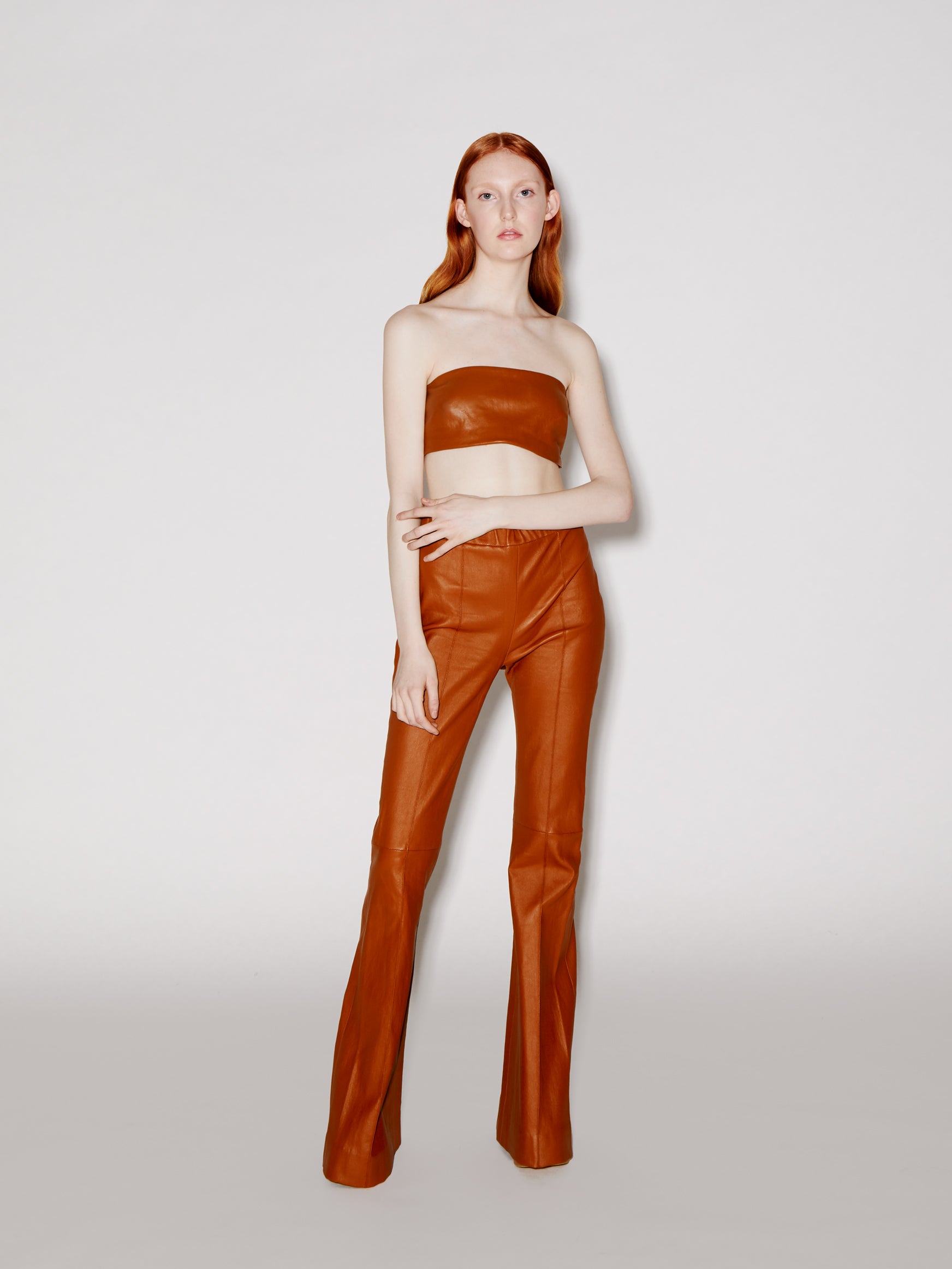 Designed with a classic ‘90s-inspired bandeau shape, this versatile bra top is elevated by its leather construction. Soft, stretch lambskin wraps around the bust, offering a convertible silhouette that can be worn under or over myriad styles.