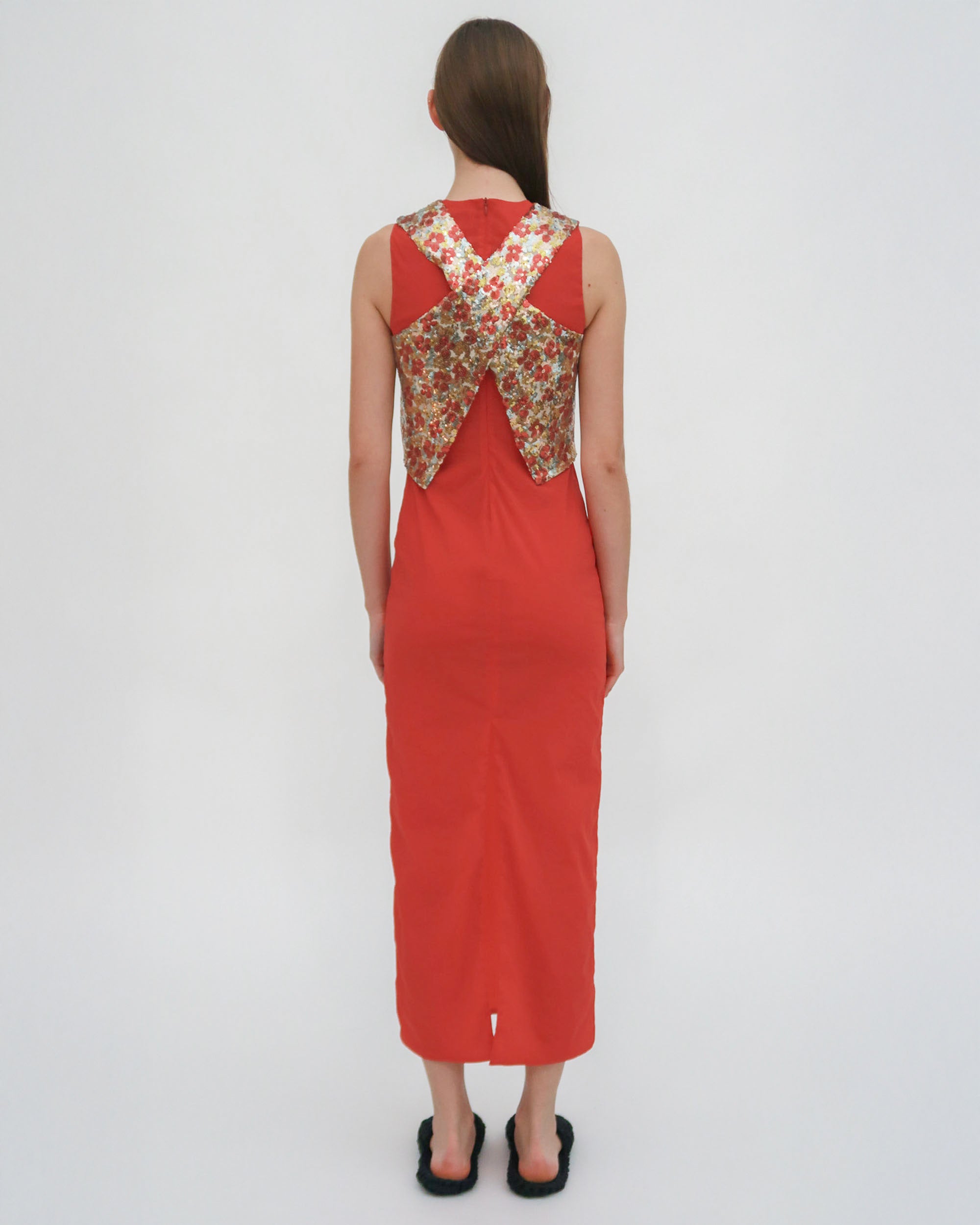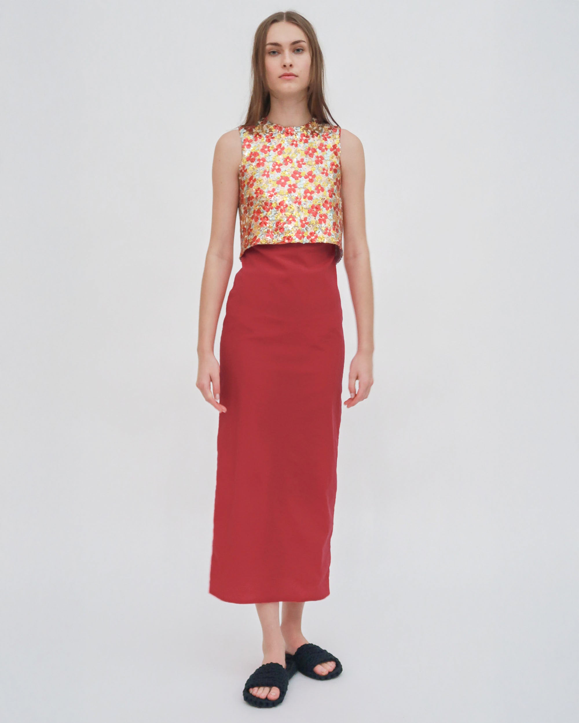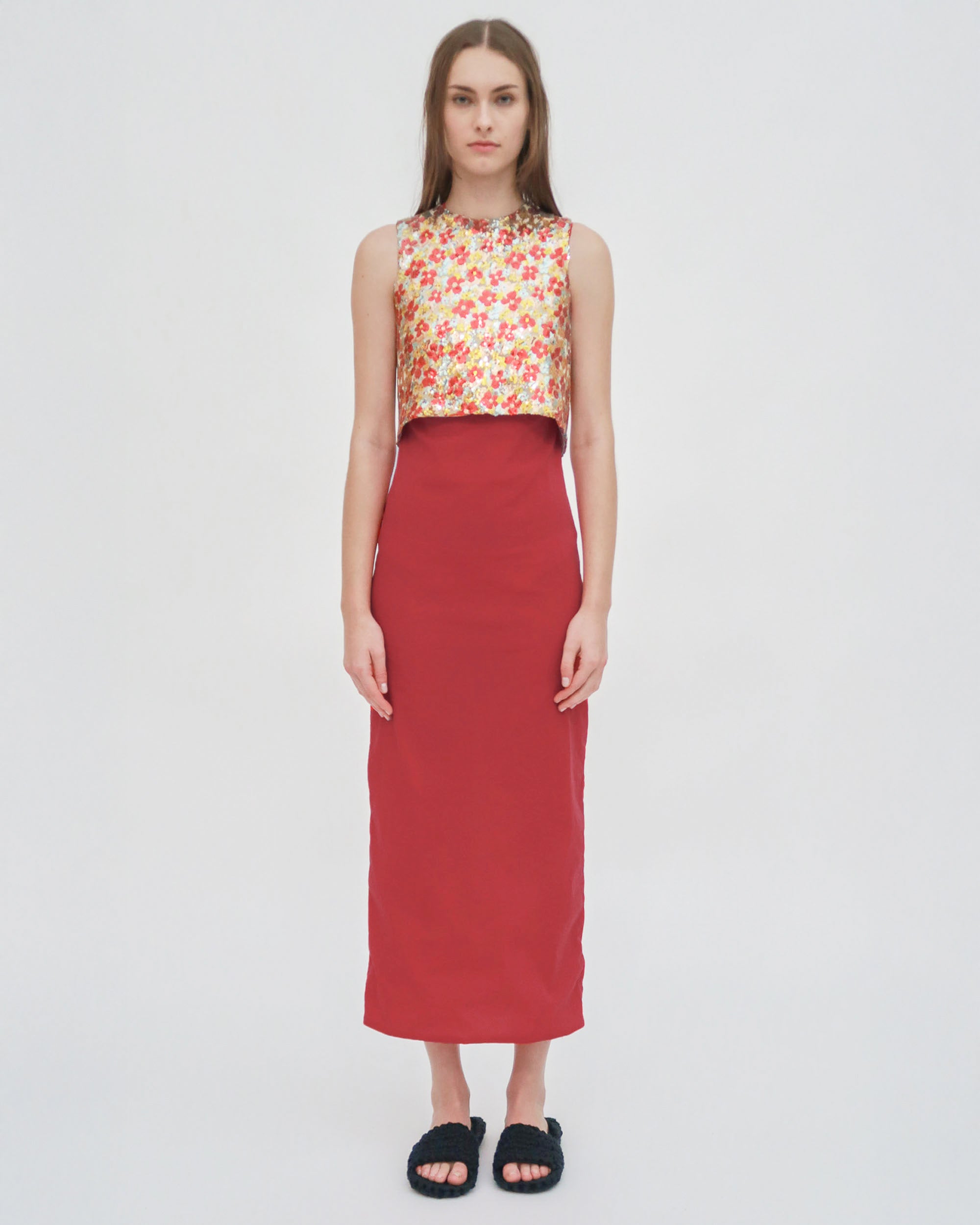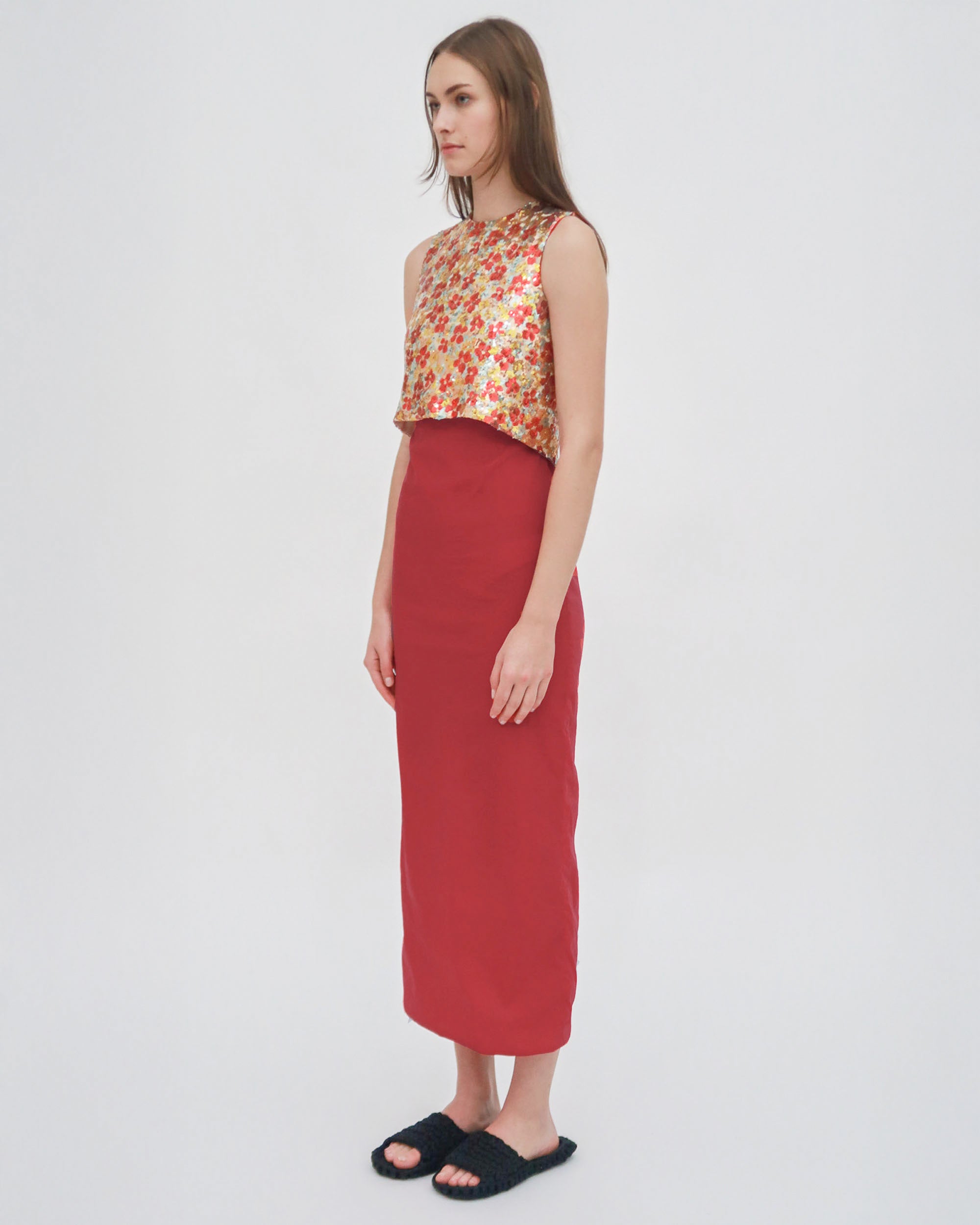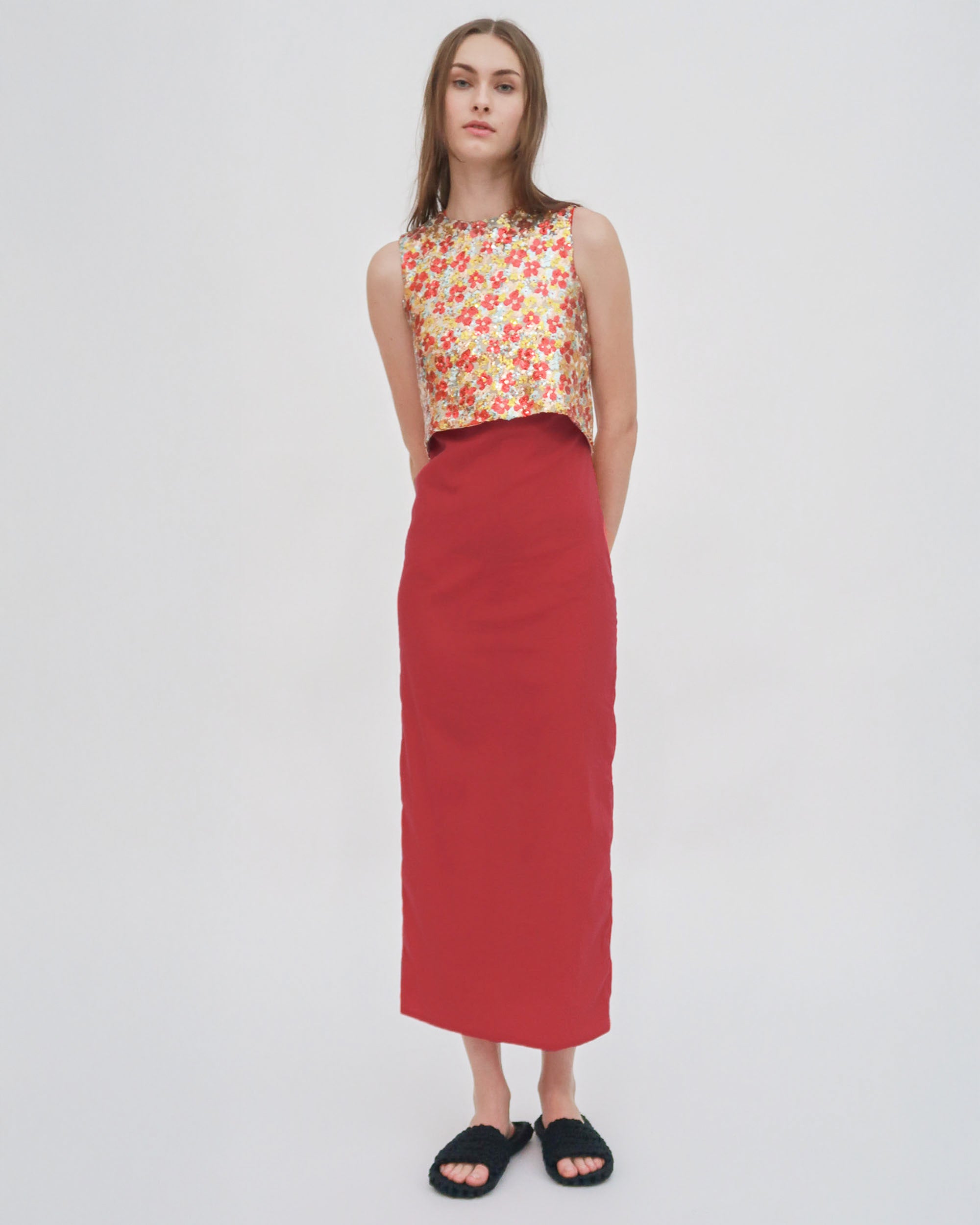Updating a silhouette from Spring 15, the Cropped Cross-Back Top spotlights Rosetta Getty’s signature simplicity in the stunning Floral Sequin Mesh fabric. The apron-style back slips on, flattering the wearer’s body with a shorter waist length.