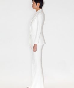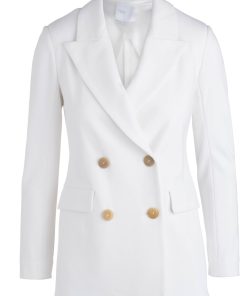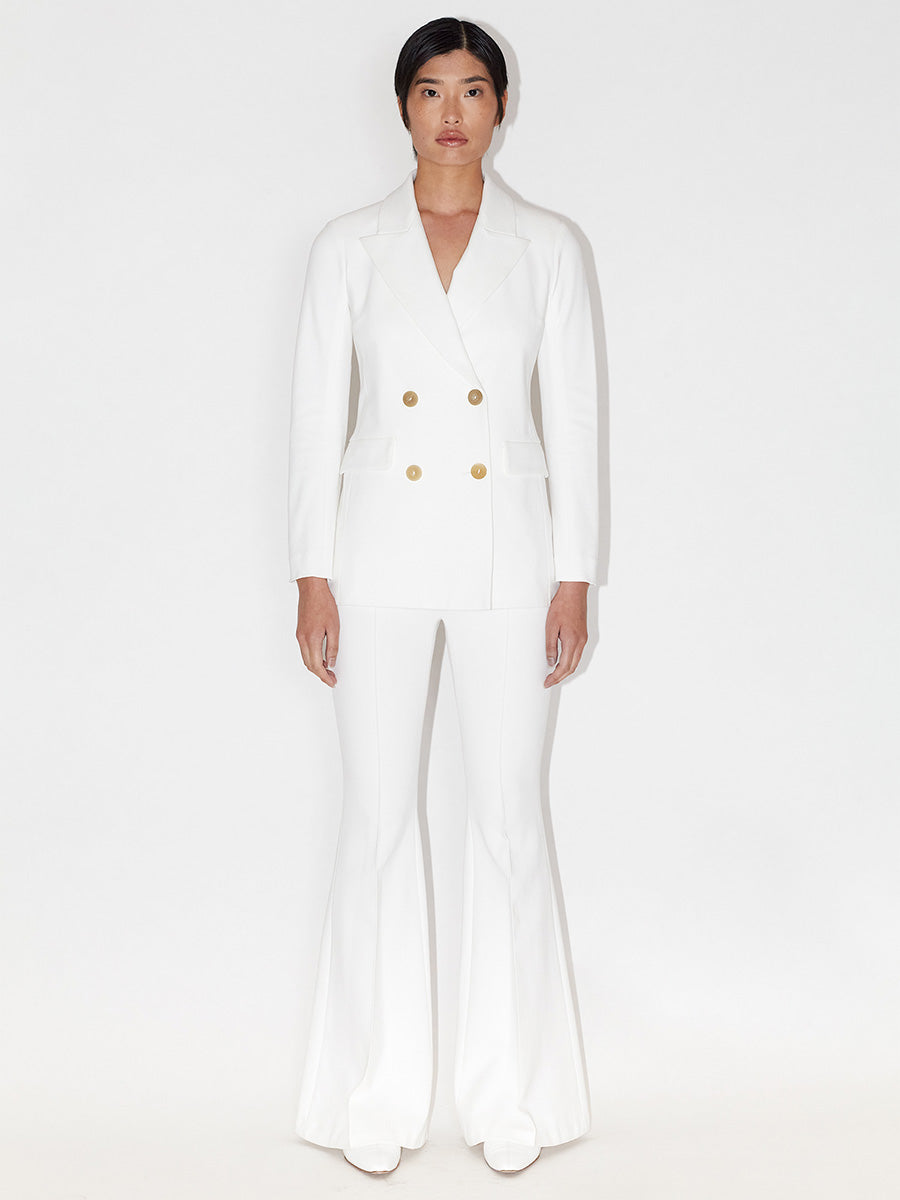 Our signature double-breasted peak lapel jacket, crafted from a luxurious, lightweight white interlock jersey.