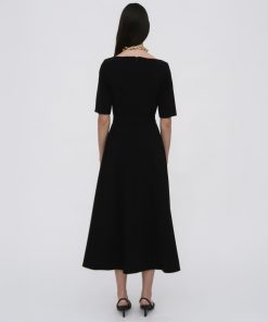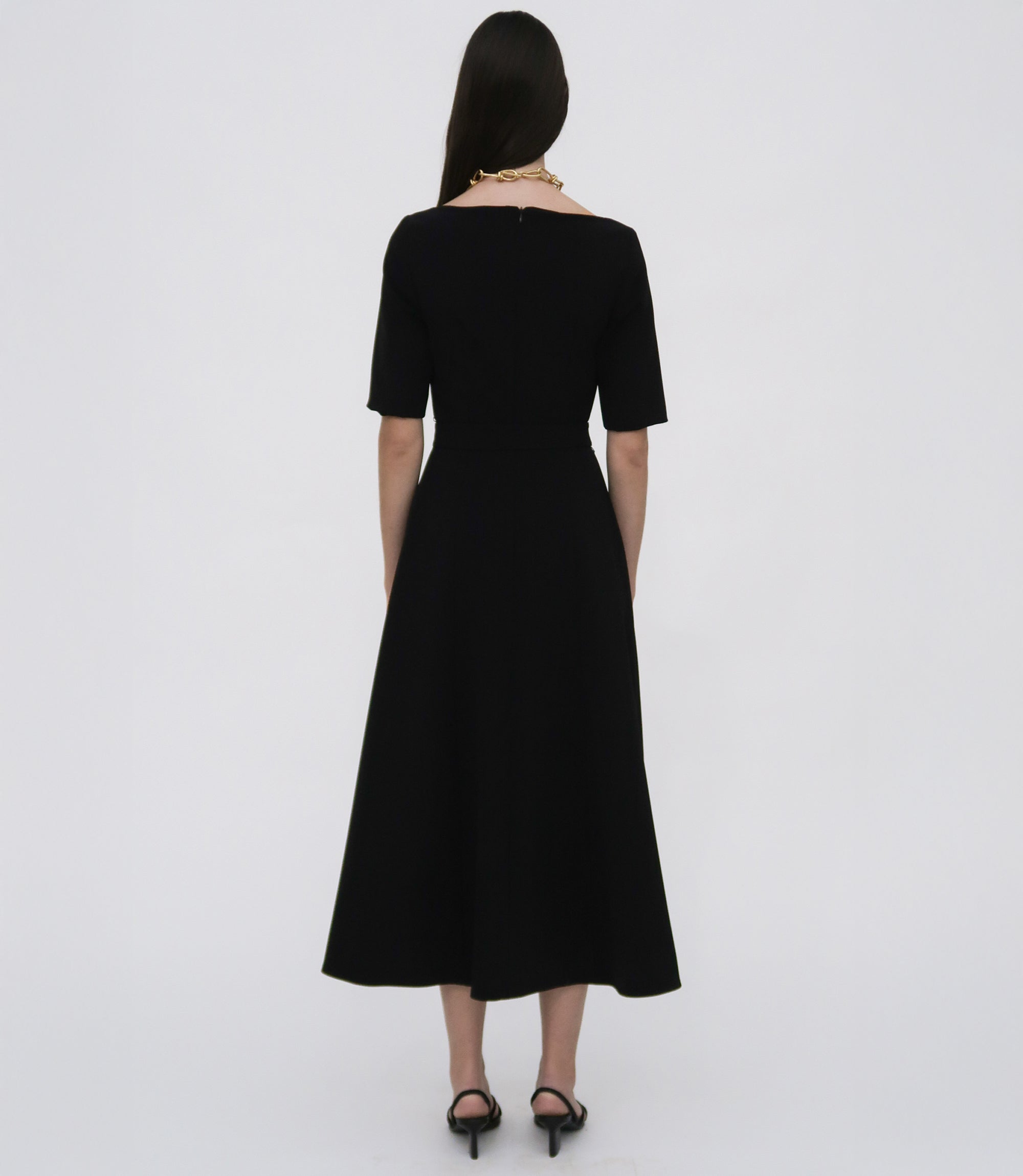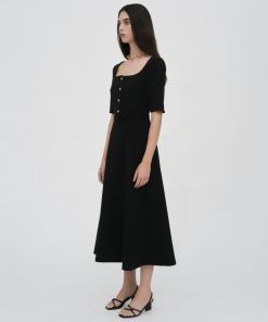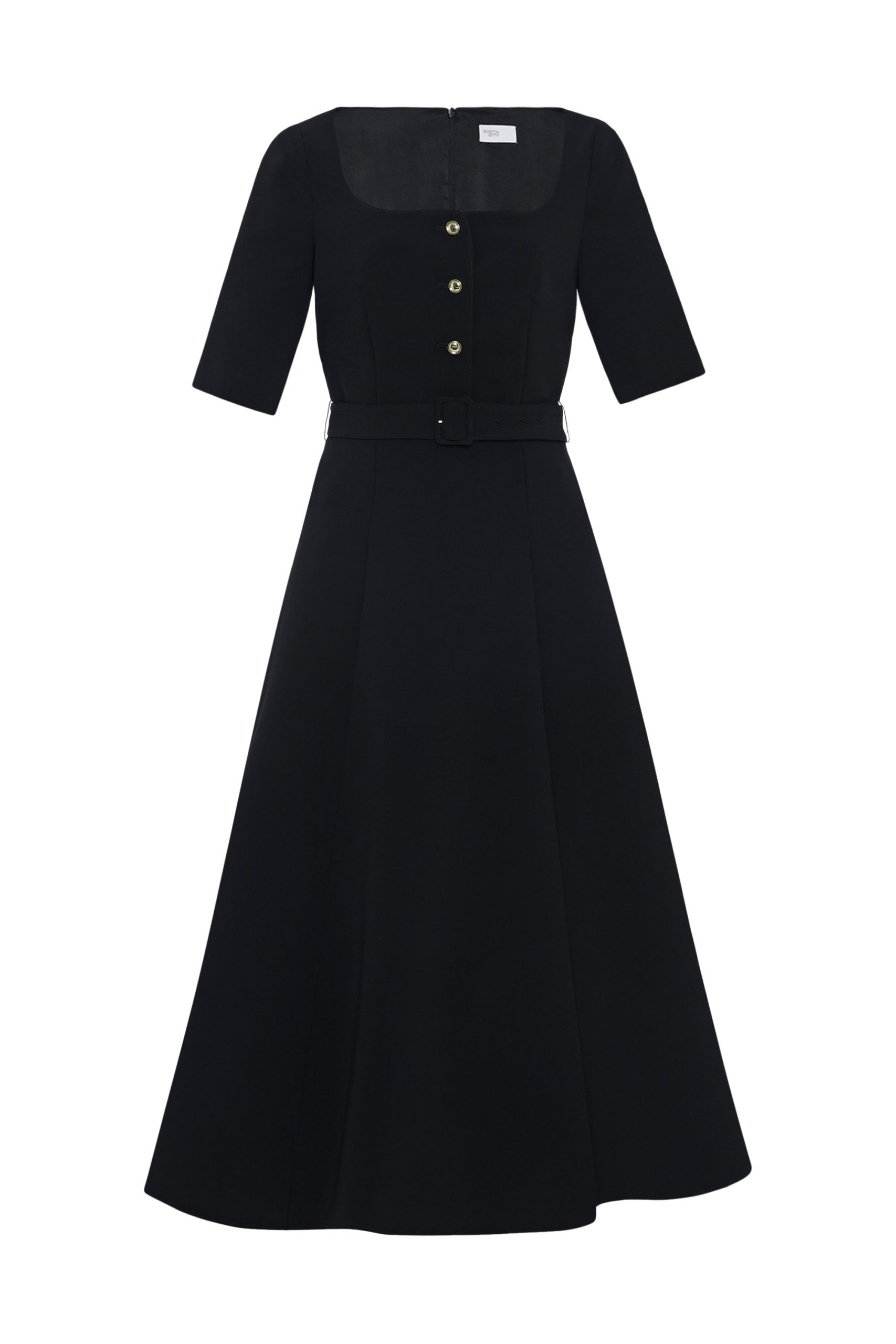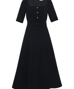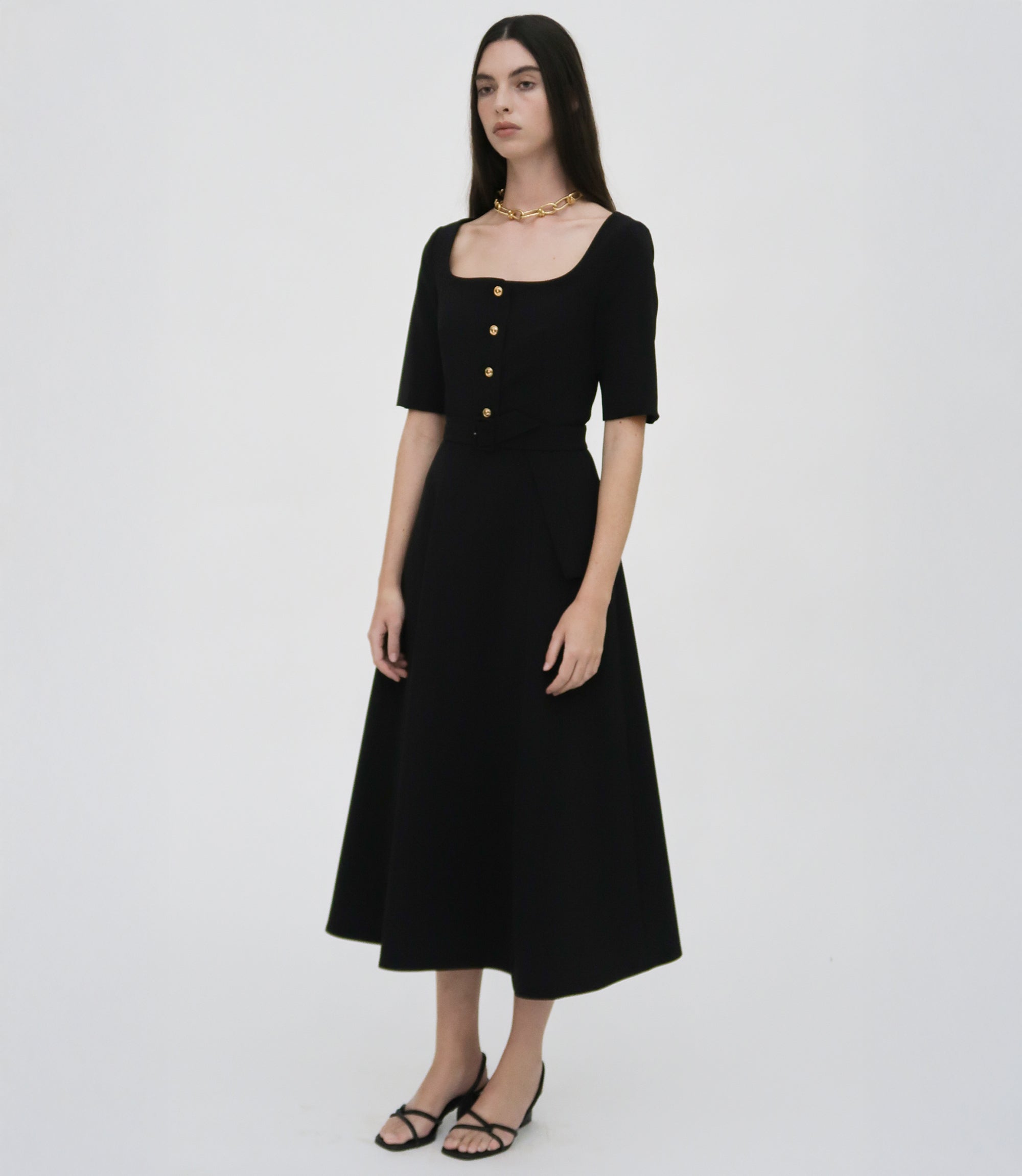 The Fitted Button-Front Dress flatters with a deep square neckline and fitted bodice, an ideal piece for transitioning between daytime and evening wear. Our signature Cady Suiting lends fluidity to the silhouette, with a self-belt to define the waist before flowing into a full, A-line skirt.