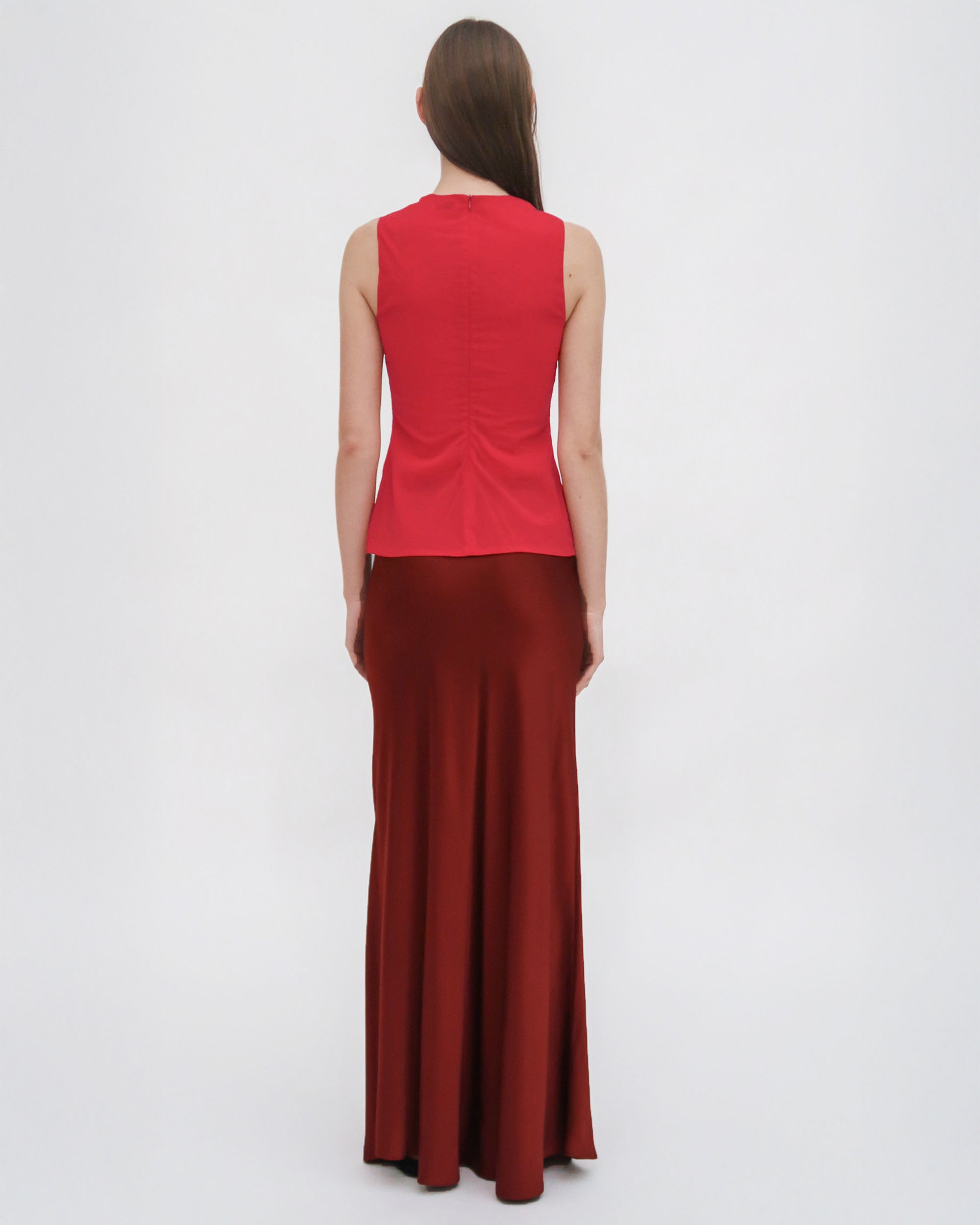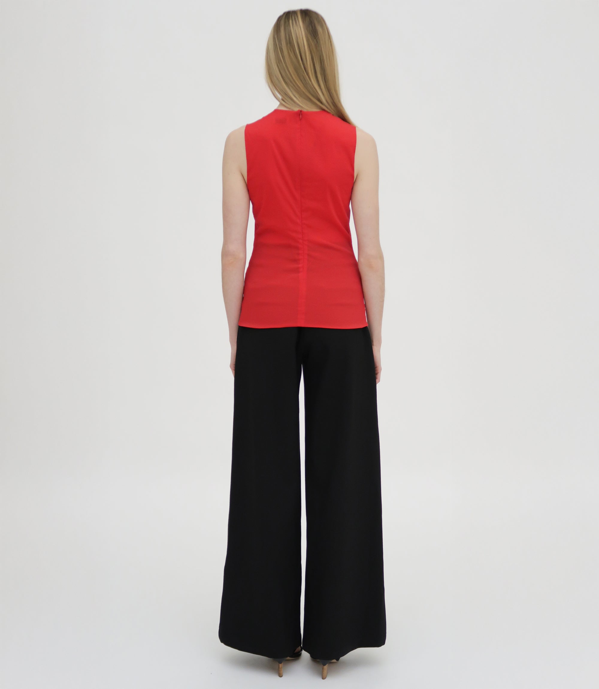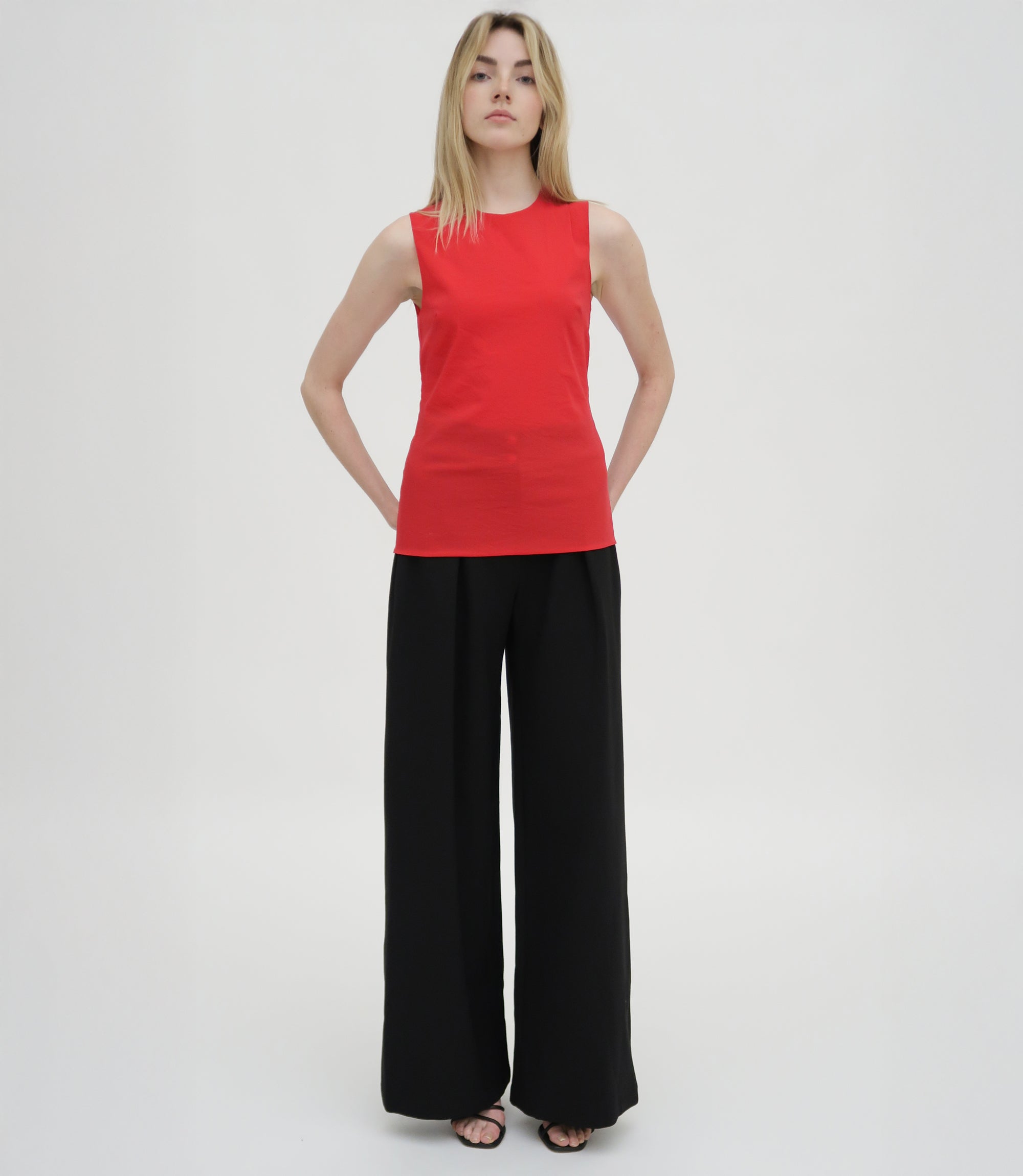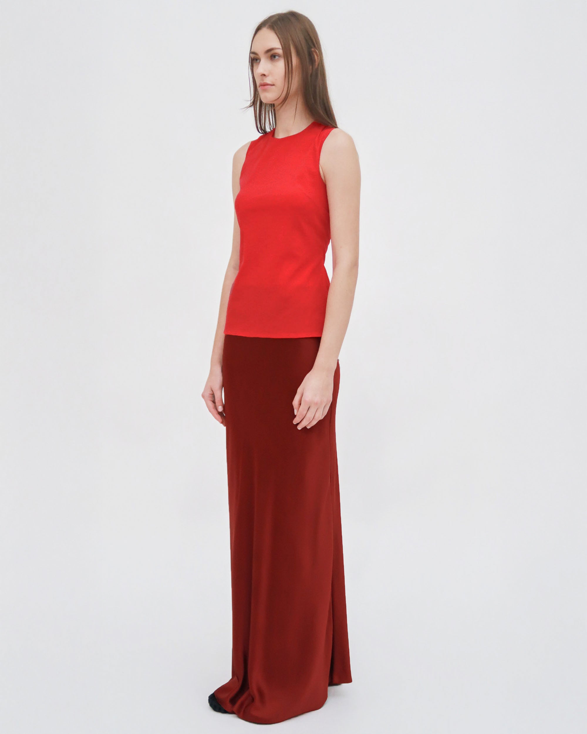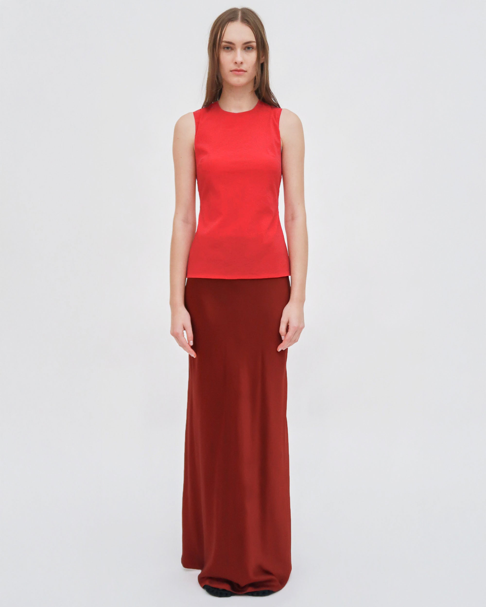 Crafted of Fluid Stretch Organza, a semi-sheer fabric with comfortable stretch, the Fitted Crewneck Tank Top is a classic fitted shell top. It can be worn as a base layer or paired with other materials for a dimensional look, but with two layers of fabric, it offers adequate coverage for wear on its own.