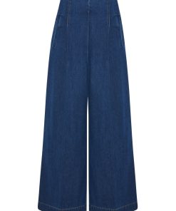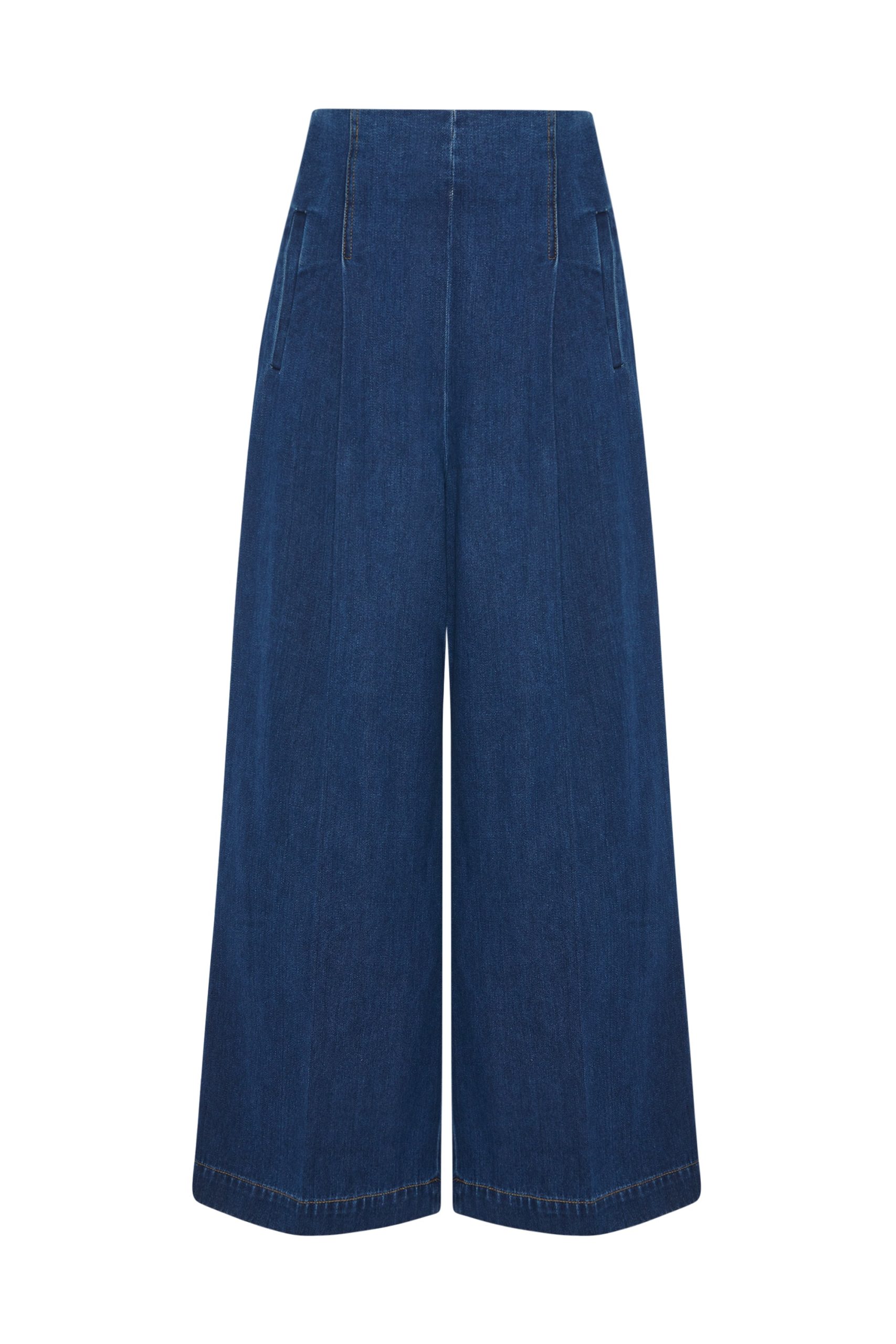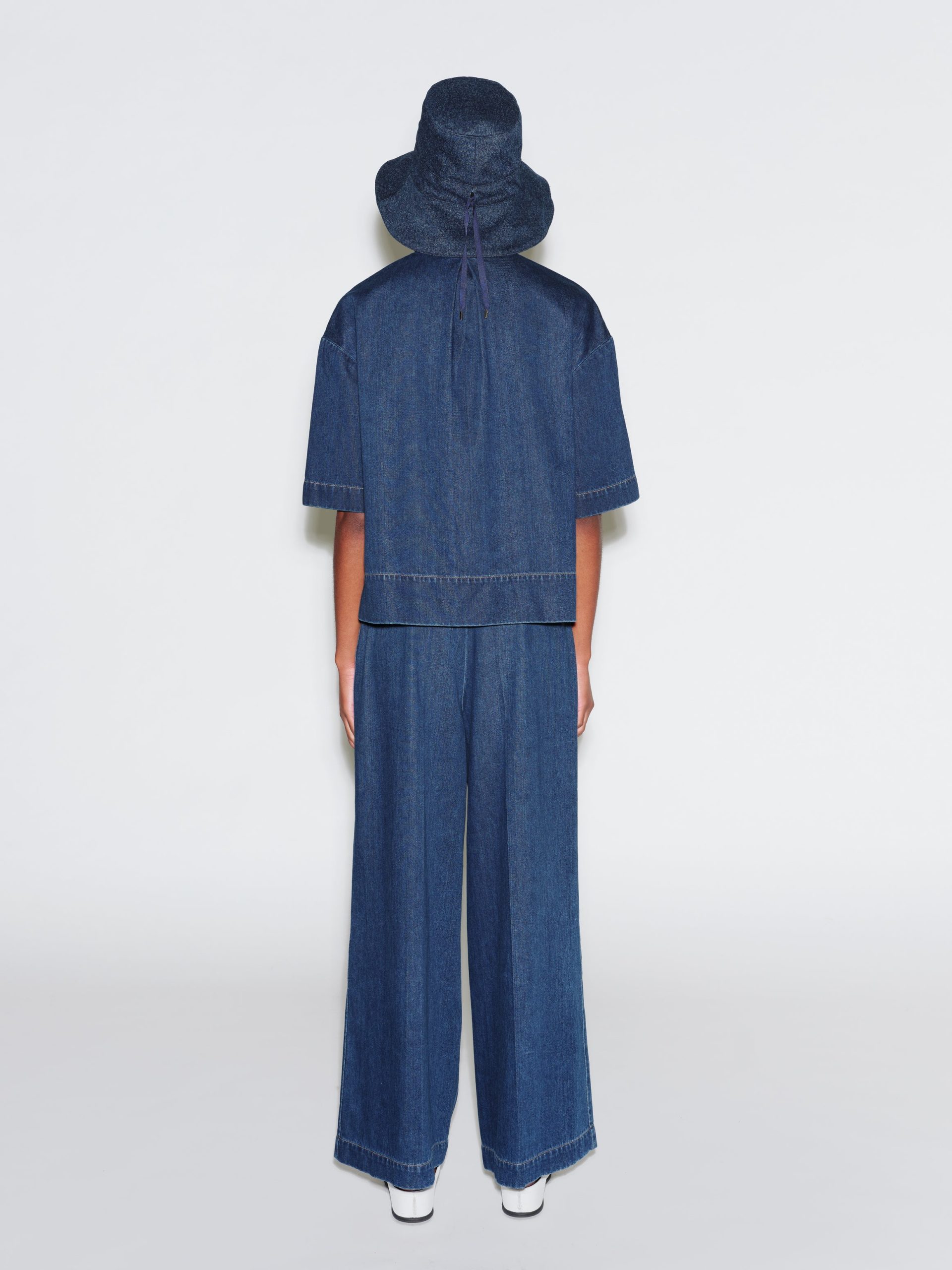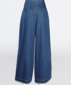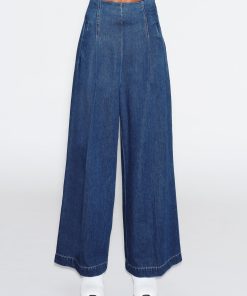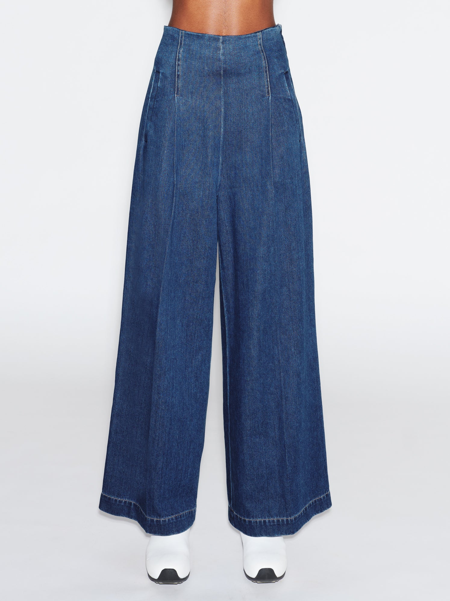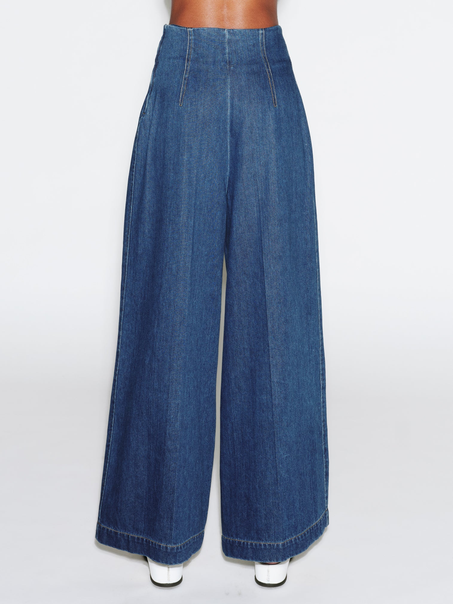Stitched pleating shapes the waist of Rosetta Getty’s new Spring 24 pant style. Cut to a high-rise, wide-leg silhouette, the soft enzyme-washed denim fabrication lends polished drape to the versatile silhouette, which pairs polish with ease in equal measure.