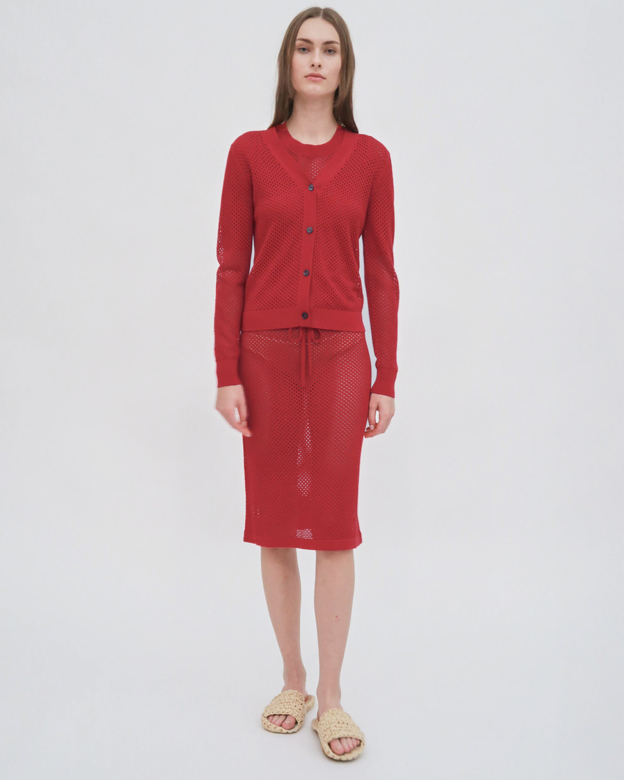 Knit to an open mesh finish, Rosetta Getty’s Spring 25 pointelle cardigan has a delicate feel. Transparent when worn on its own, the cardigan is ideal for layering—lending opacity and tangible dimension to the breathable style.