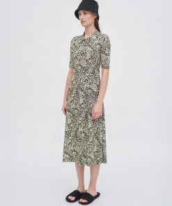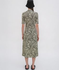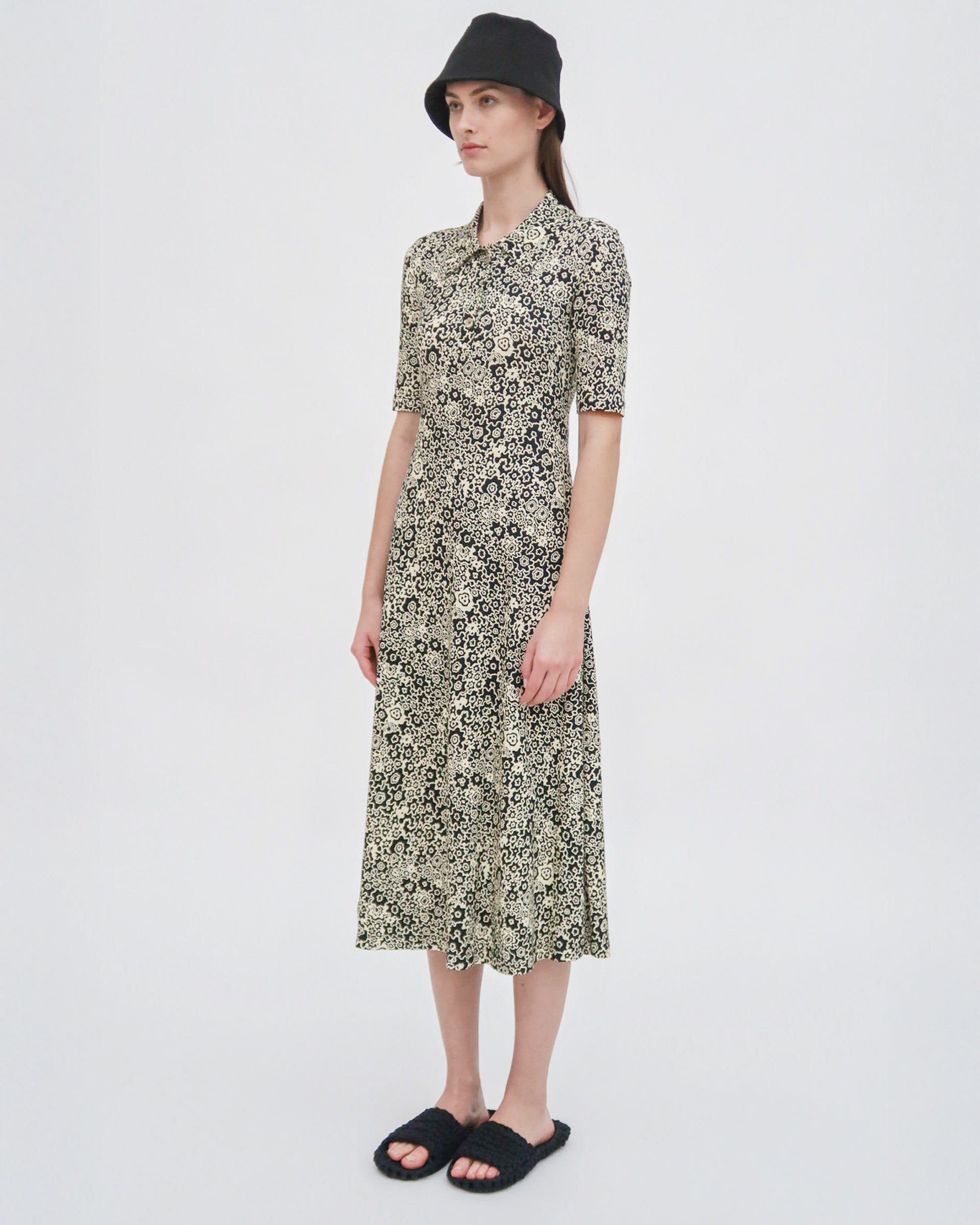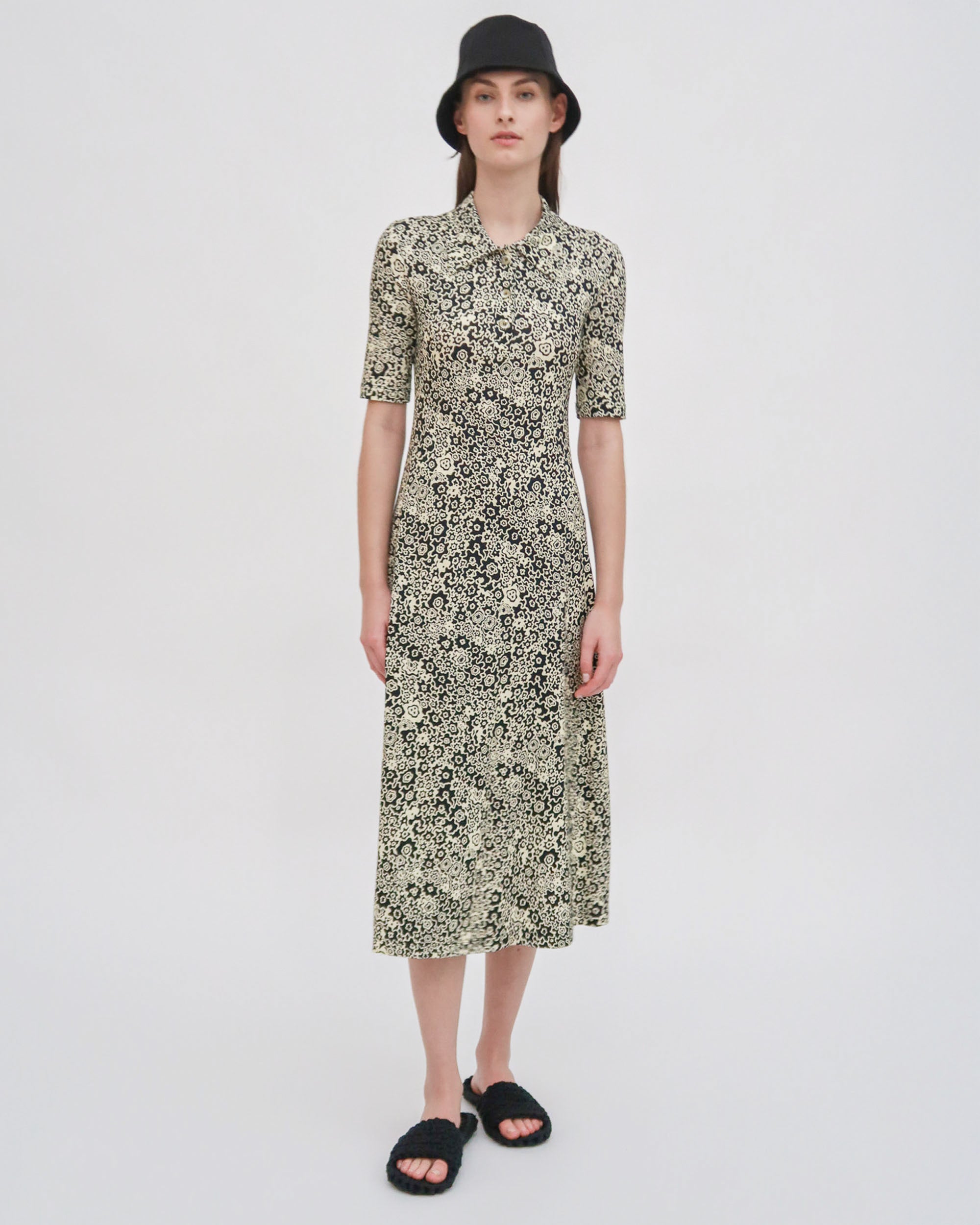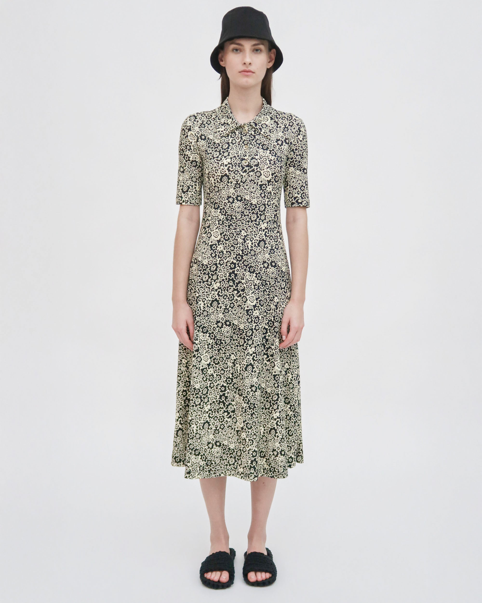 The seasonal graphic two-tone Floral Squiggle pattern lends complexity to Rosetta Getty’s minimalist midi dress. Crafted of stretch cotton jersey, it is fitted through the bodice with a polo neckline, giving way to a full, flare skirt.