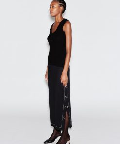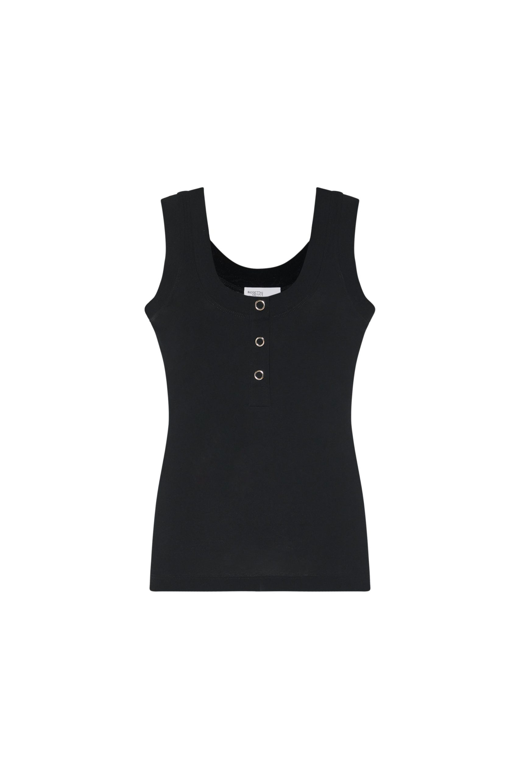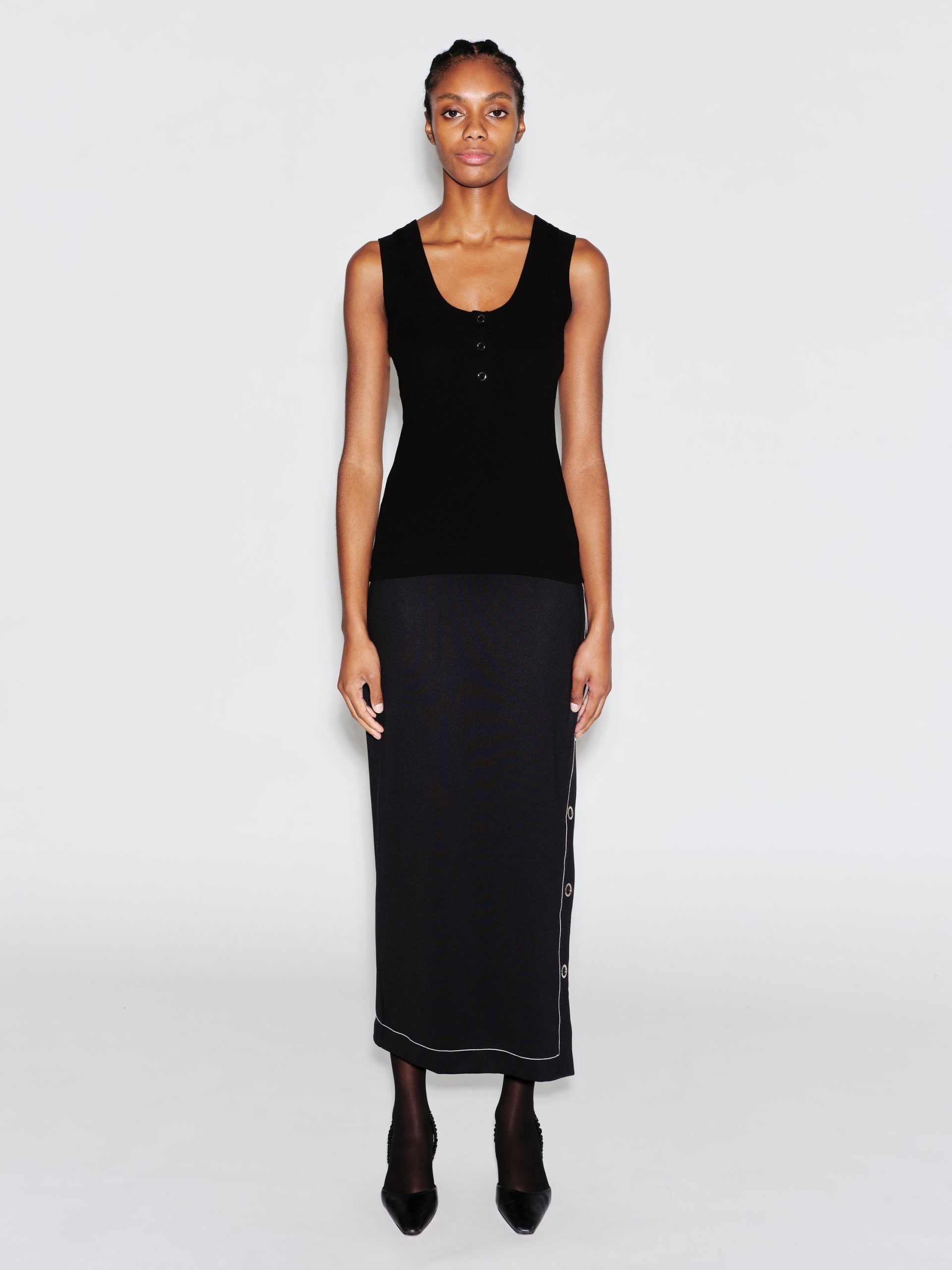 This scoop neck tank top is a new style in Rosetta Getty’s beloved Mercerized Cotton Jersey with a slim fit and a soft feel. The snap placket lends dimension to the silhouette, allowing for versatile wear – we love it beneath the long-sleeve henley top – as well as a sporty finish.