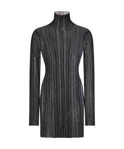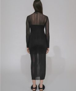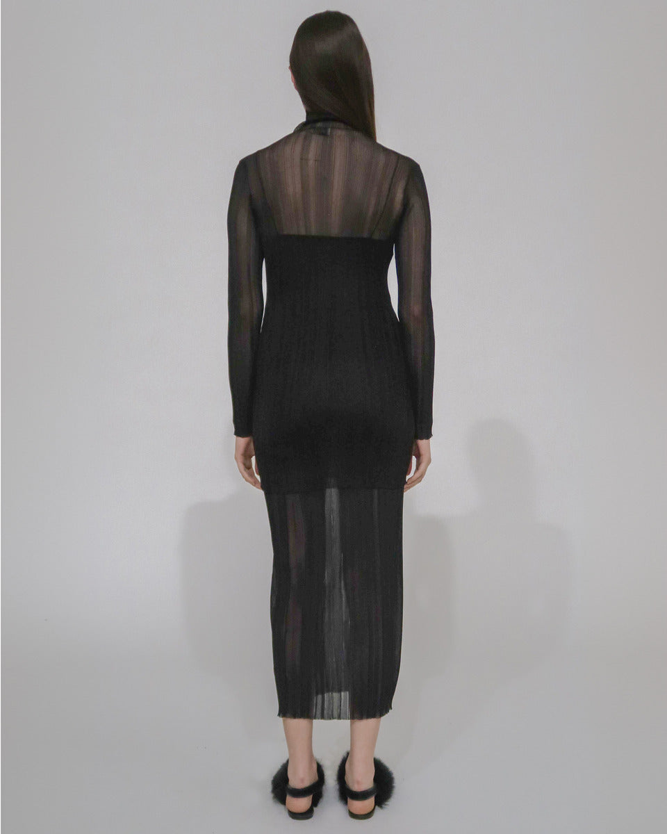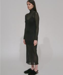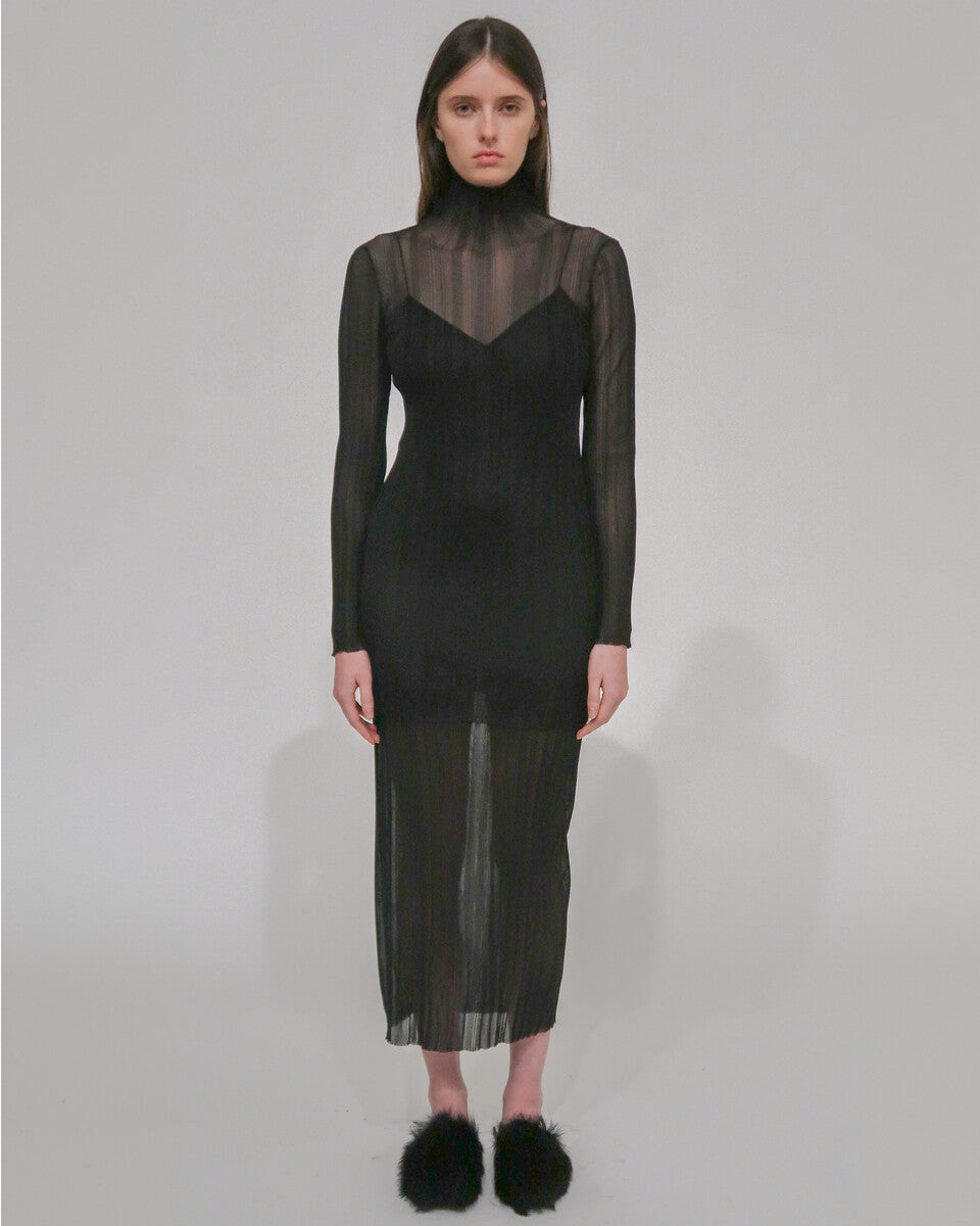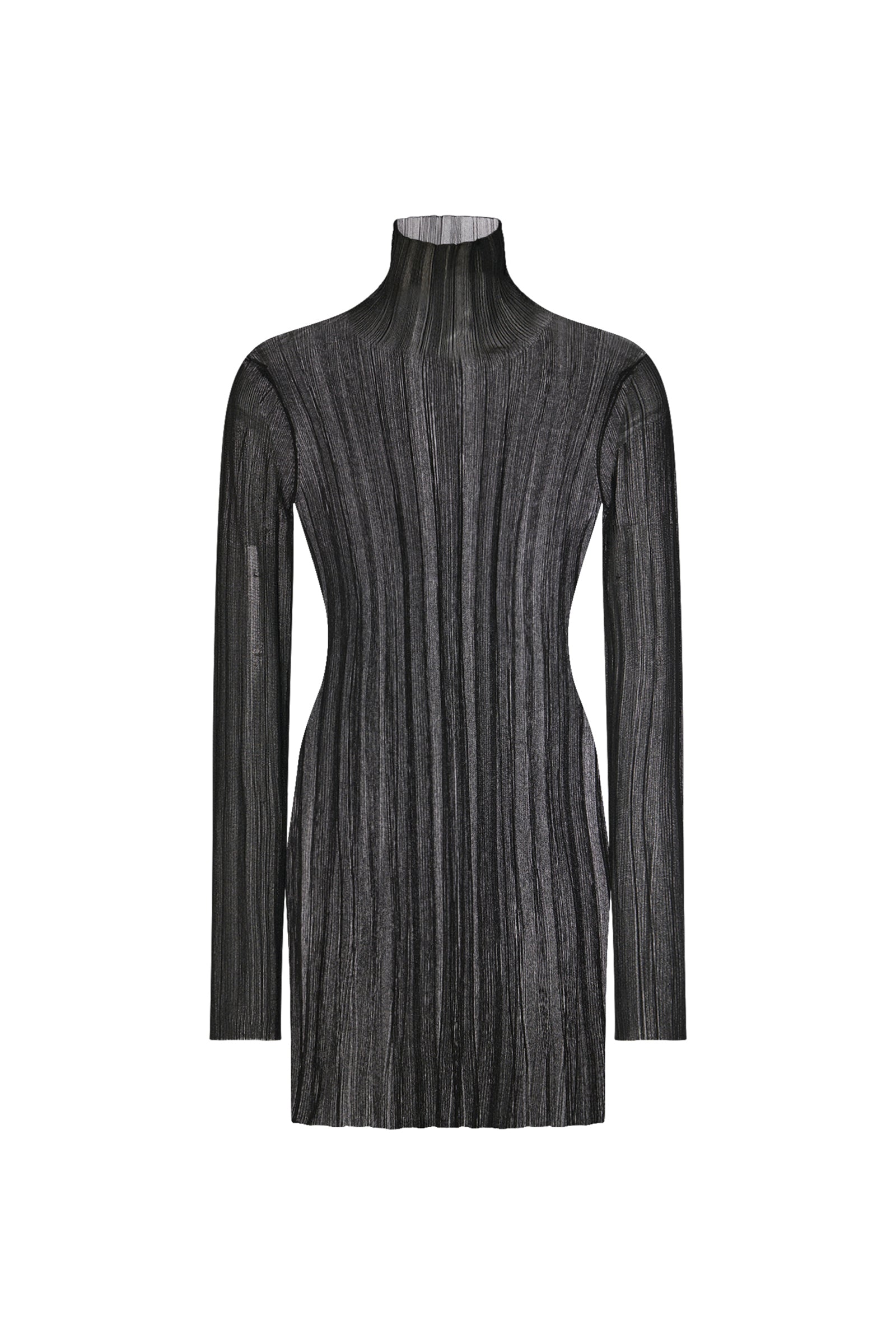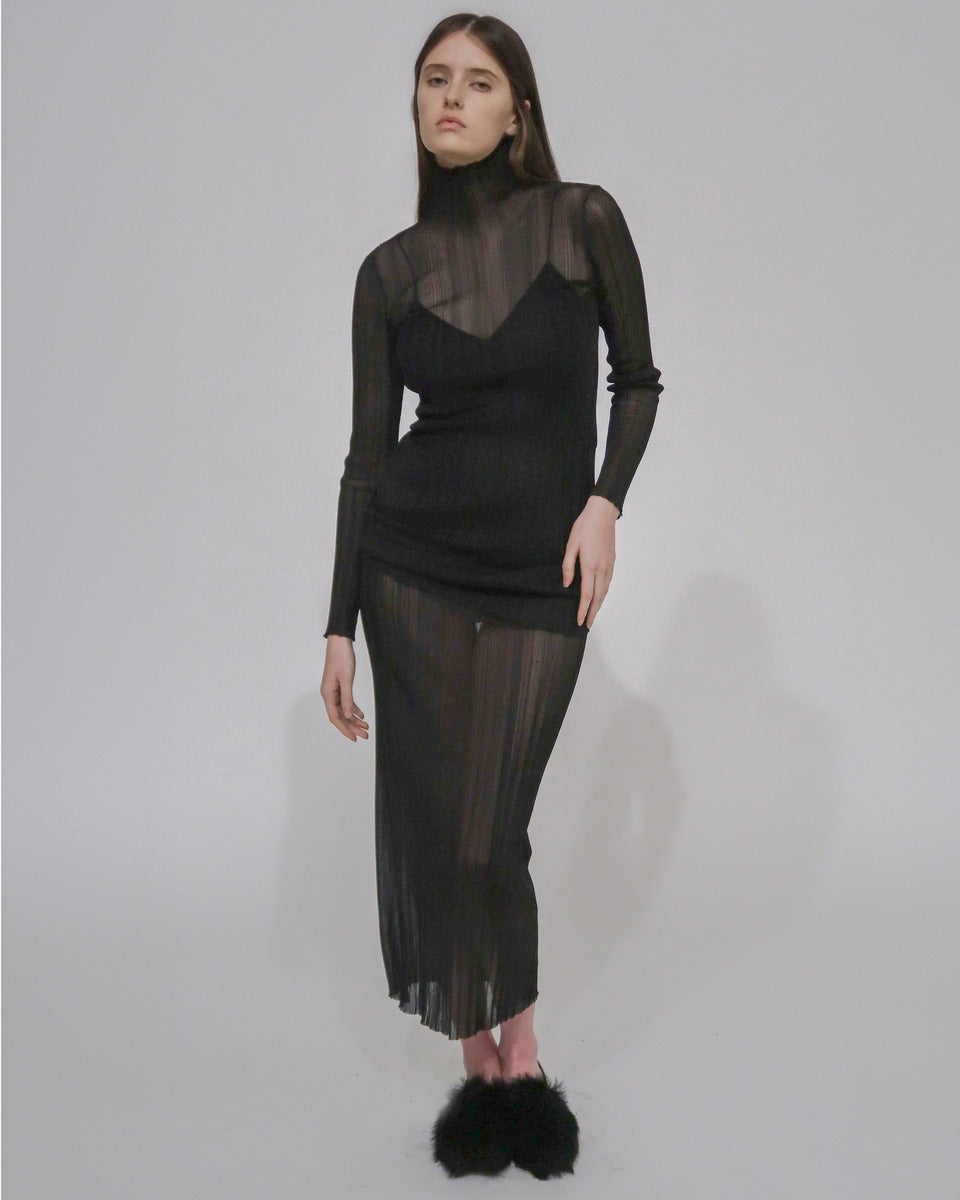 This gossamer top is designed for layering, cut in the season’s special new Nylon Mesh, a knitted plissé fabric. Completely transparent with a lightweight feel, it gently hugs the body with slim turtleneck silhouette that hits at the mid-thigh.