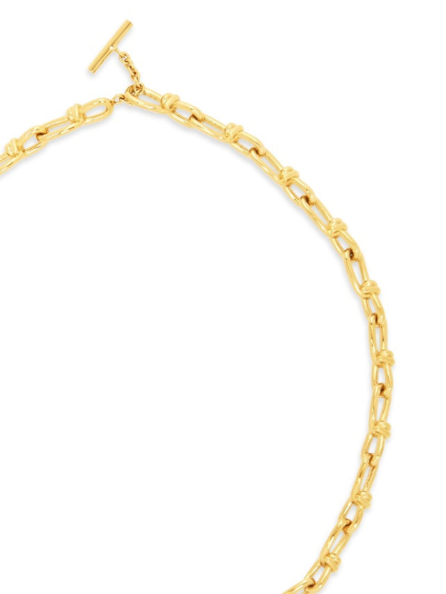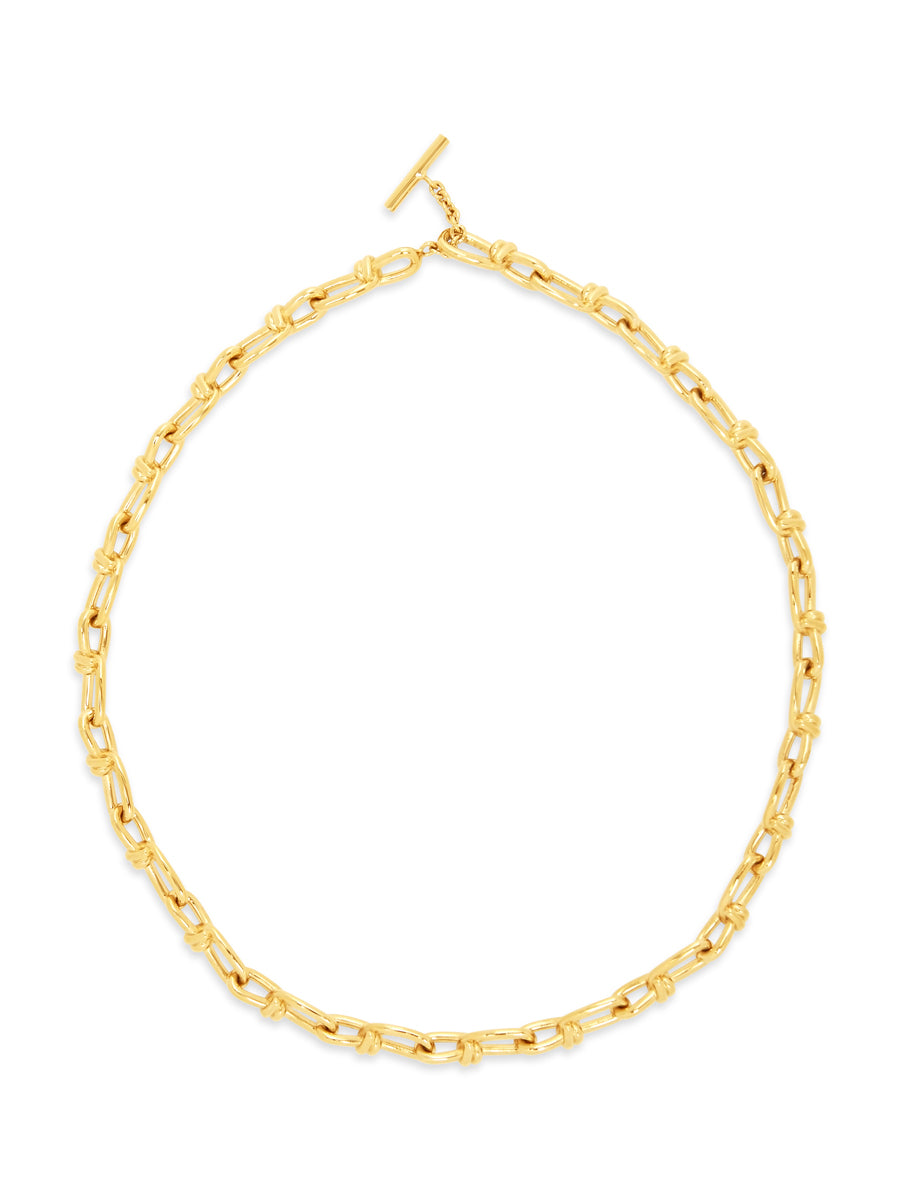 Rosetta Getty’s custom twisted chain features in a new slimmer shape. Designed with radiant 14K gold plating, the durable brass necklace boasts glittery textural links and a bespoke toggle closure, engraved with a subtle Rosetta Getty signature.