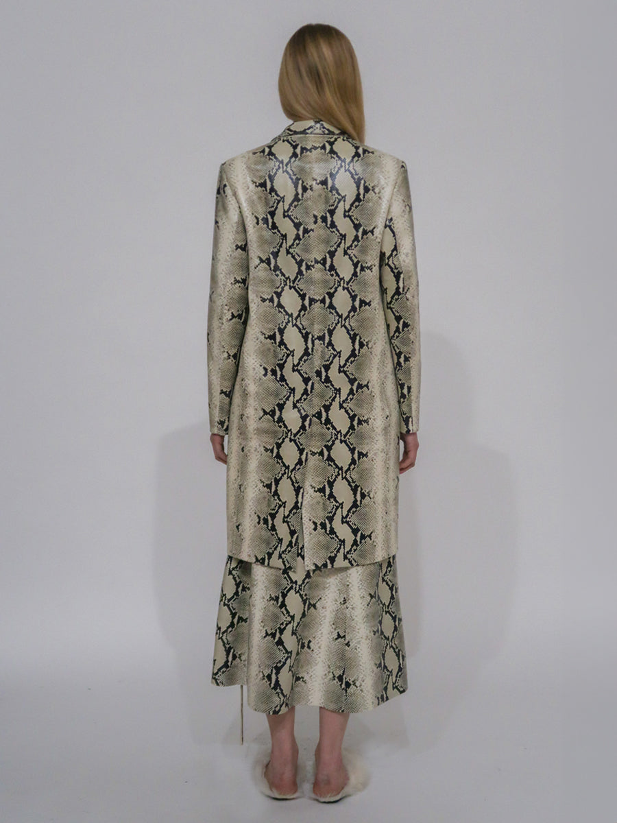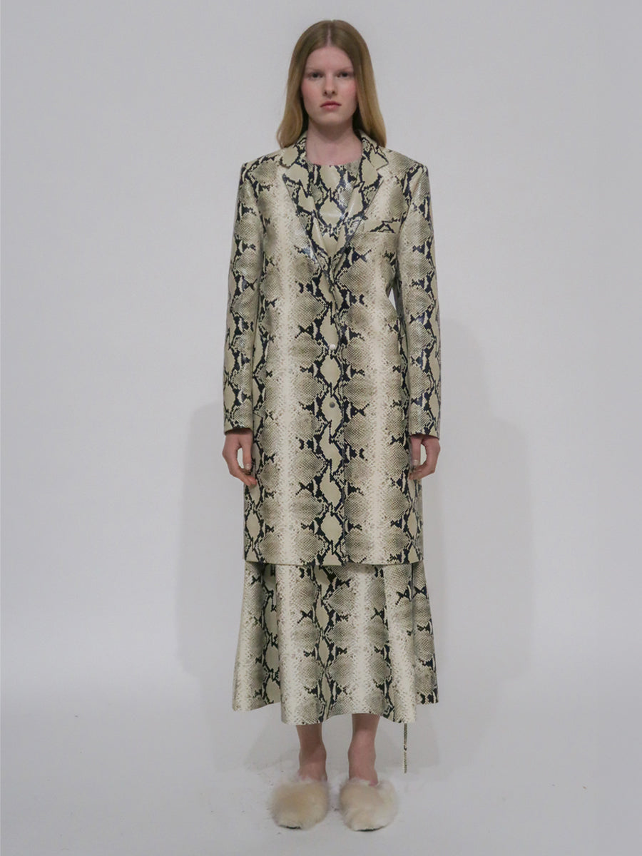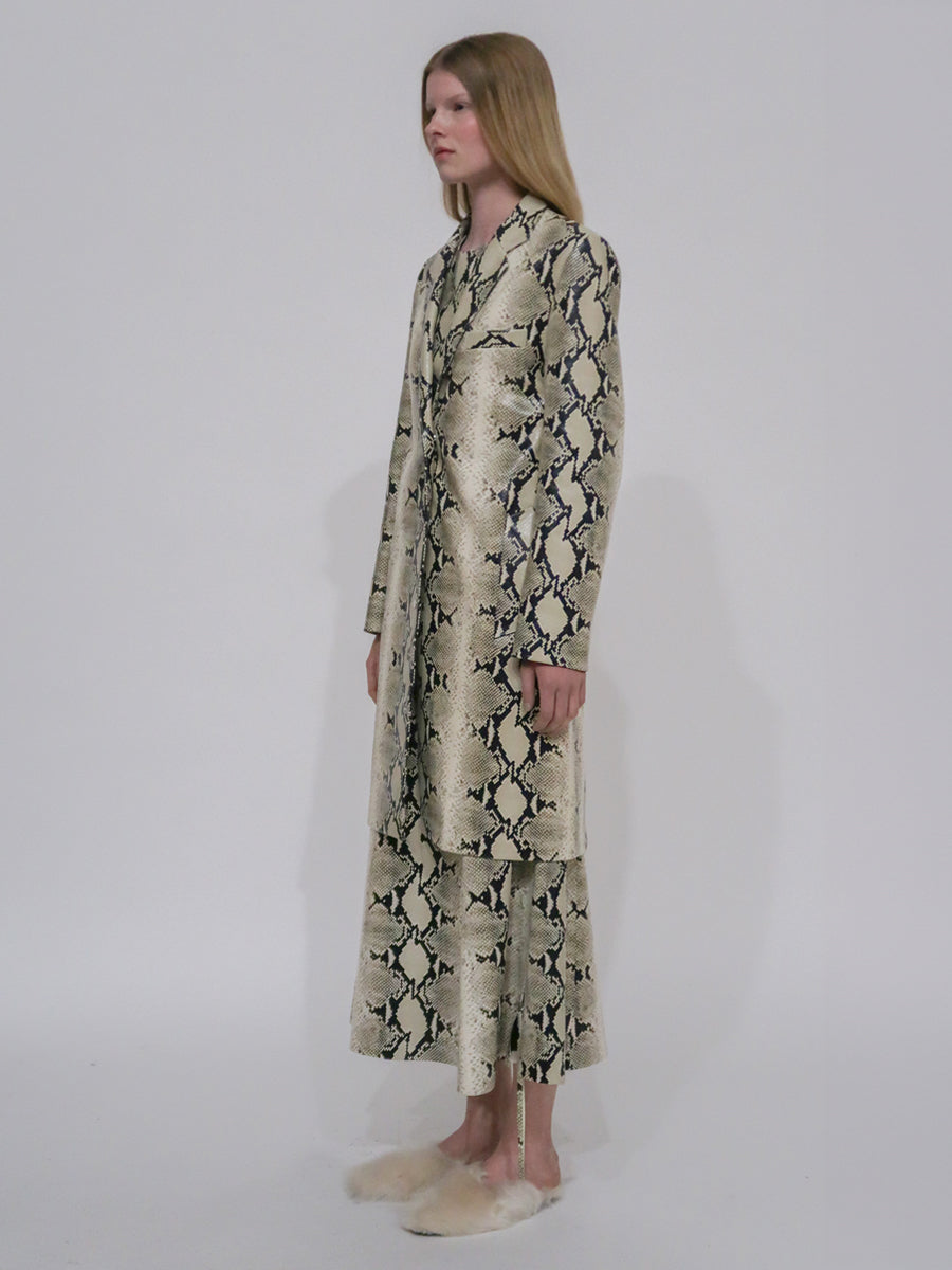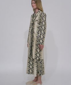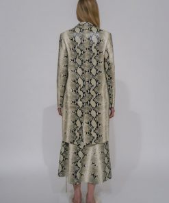 A signature silhouette of the Rosetta Getty brand, the Tailored Coat features anew in Pre-Fall 24’s Embossed Python Leather. Cut to a slim knee-length silhouette, it is finished with metal snaps that reinforce the sleek and strong nature of the style.